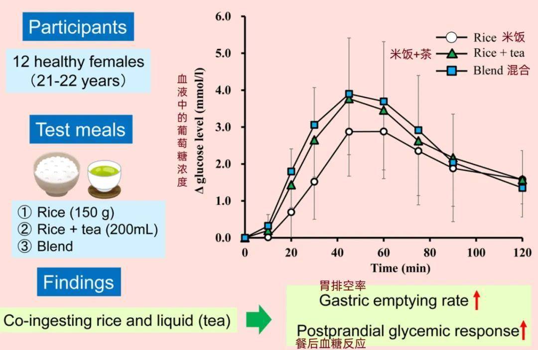 吃米饭组:吃150克白米饭吃米饭喝茶组:吃150克白米饭搭配喝200毫升绿茶混合组:吃150克白米饭淋上100毫升绿茶,再搭配喝100毫升绿茶。吃完测试餐后,对受试者测量餐后血糖。与仅吃米饭相比,无论是边吃饭边喝茶的人,还是吃茶泡饭还喝茶的人,都有着更高的胃排空率,并且餐后血糖水平更高。①