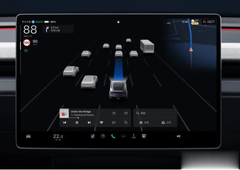 新款特斯拉Model Y的内饰还是我们熟悉的“毛坯房”设计布局,换装了全新的方向盘,并且方向盘后面的拨杆也没有了,也是屏幕换挡,至于灯光、转向、雨刮、语音助手等功能,则是可以在方向盘左右两侧操作,为物理按键控制。